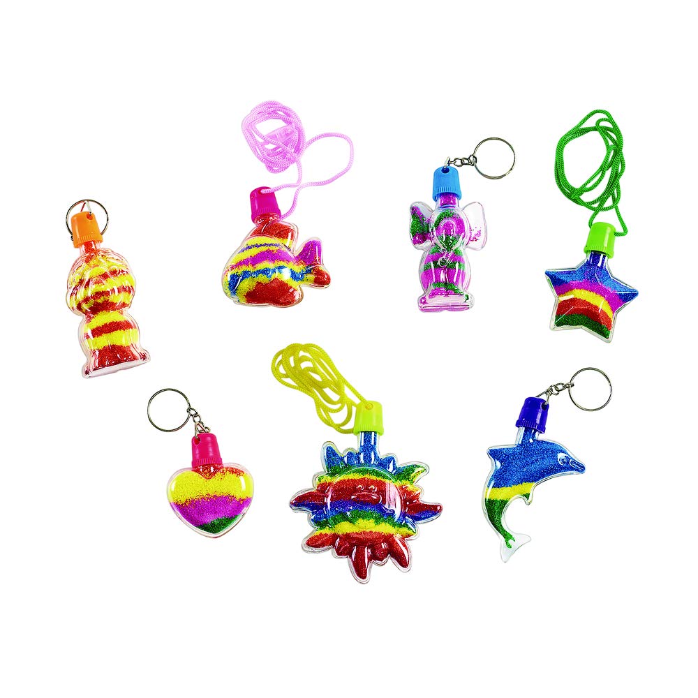 - WHAT YOU GET: 4 each of 7 bottle designs: elephant, dolphin, fish, heart, lion, star & sun. 14 necklace toppers, 14 key chain toppers, 14 funnels. Each bottle holds 1/2 – 2 oz of sand. Bottles are 2 to 3 inches each. Sand sold separately.